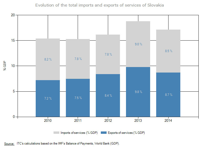 Evolution of the total imports and exports of services of Slovakia as % of GDP