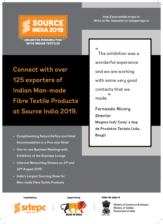 Synthetic & Rayon Textiles Export Promotion Council (SRTEPC) organizuje RBSM, známe ako: "Source India" organizuje od 21. do 23. augusta 2019 v Bombajskom výstavnom centre v Goregaone 3-dňový Flagship Export Promotion Program Textil Event, schválený Ministerstvom obchodu a priemyslu v rámci programu MAI.